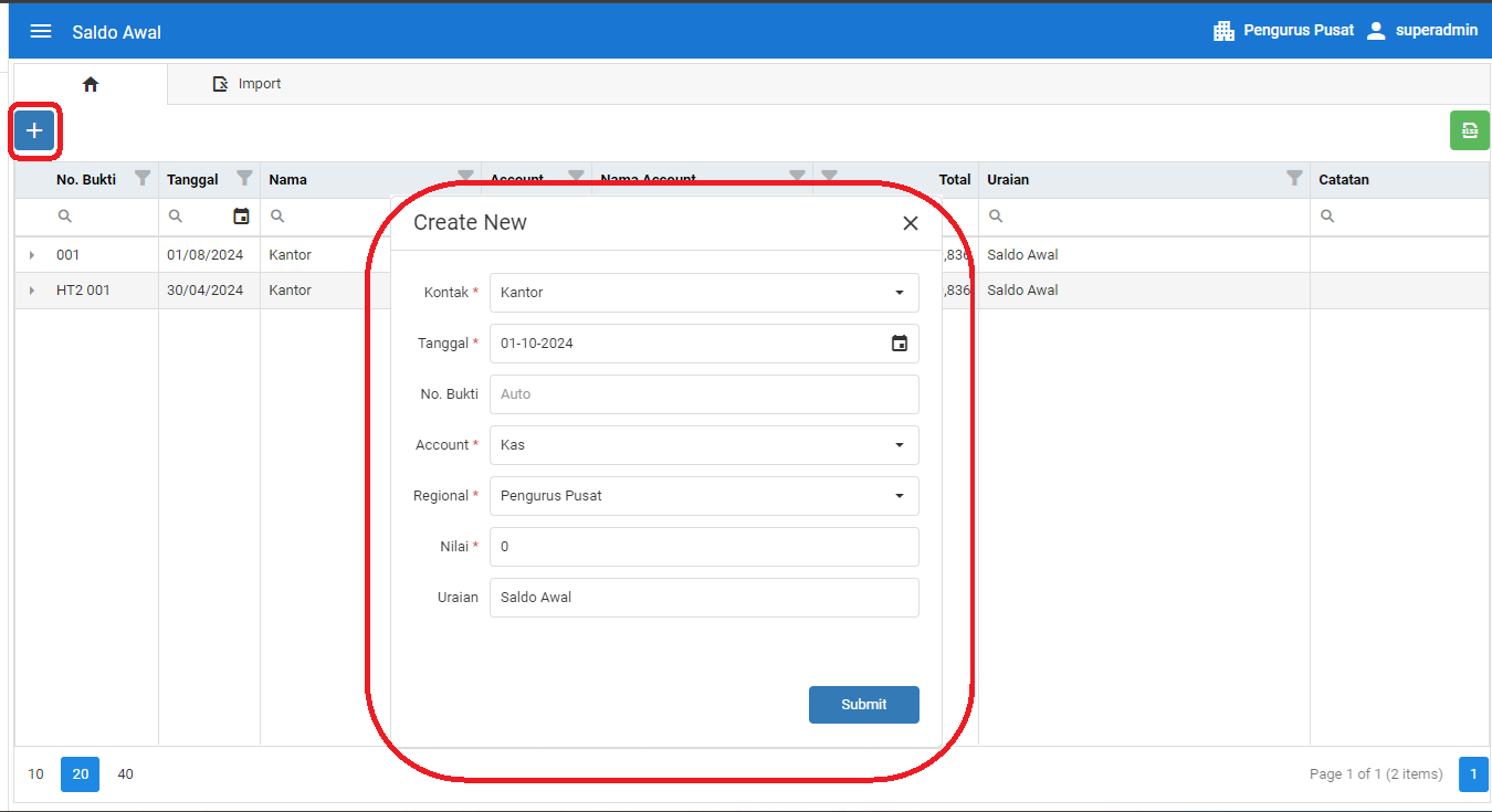 Untuk input Saldo Awal akun bisa melalui klik tombol + , kemudian lengkapi Form Saldo Awal, setelah itu klik Submit.