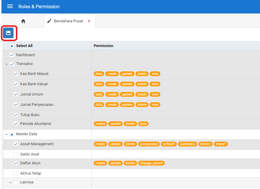 Setelah selesai mengisikan data role, klik icon Simpan pada tanda kotak merah.