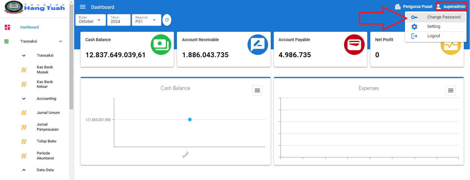 Klik nama user di pojok kanan atas, kemudian pilih Change Password