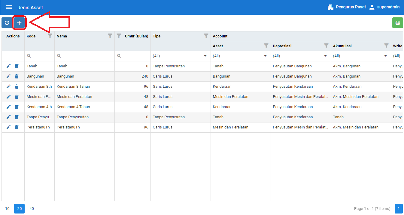 Klik sub menu Master Data, kemudian klik menu Jenis Asset. Kemudian klik tombol + seperti tanda kotak merah di bawah ini.
