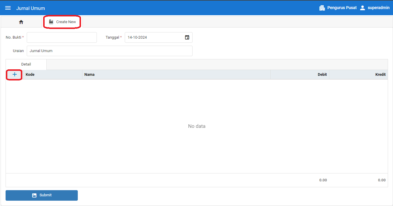 Klik sub menu Transaksi, kemudian klik menu [Jurnal Umum], klik [Create New].