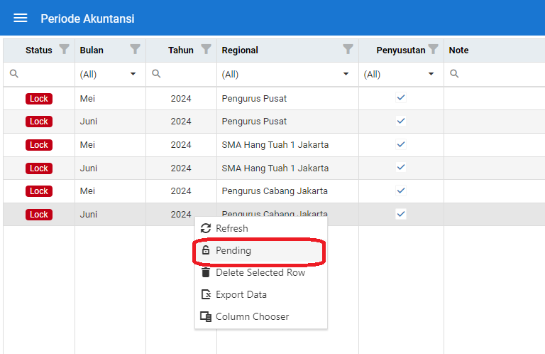 Untuk membuka periode bulan tertentu, silahkan klik kanan data periode yang akan dibuka, kemudian pilih pending.