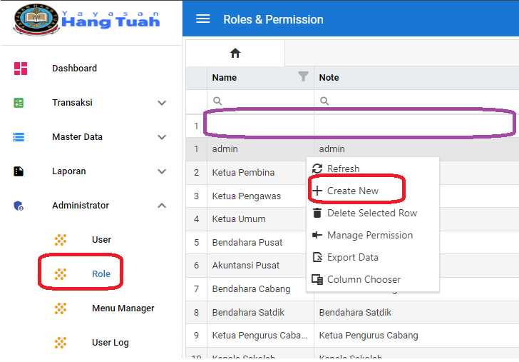 Kemudian klik Kanan, kemdudian Pilih Create New, kemudian isikan role yang akan di buat pada paris yang ditandai kotak berwarna ungu.